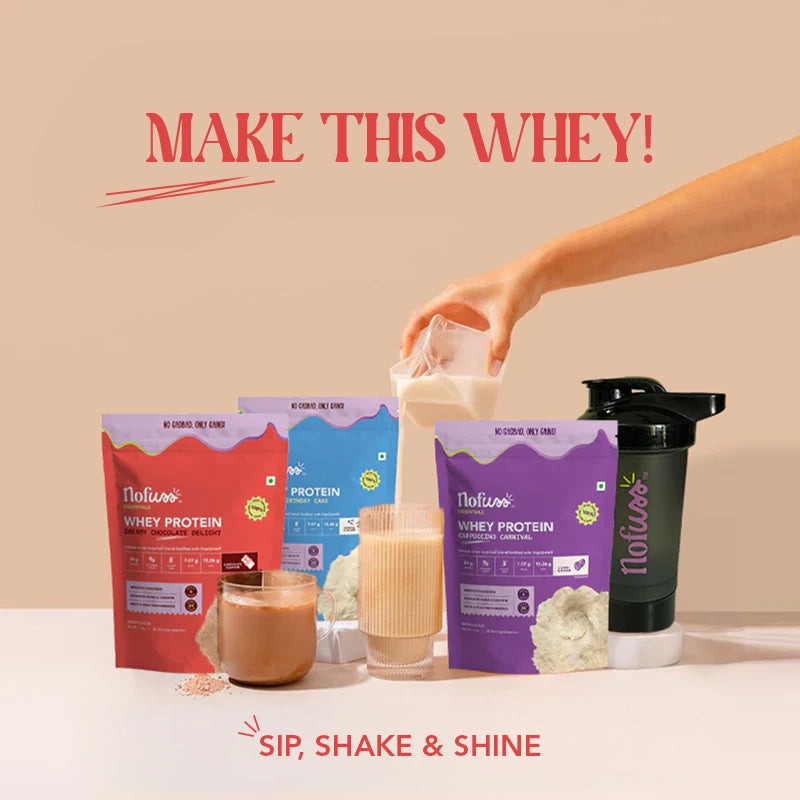 Elevate your well-being with NoFuss Essentials Whey Protein, fortified with DigeZyme®—a proprietary blend of 5 digestive enzymes and a power-packed mix of 24 essential vitamins and minerals designed to improve digestion, enhance muscle growth and boost peak performance in 3 exciting flavours: Dreamy Chocolate Delight | Cappuccino Carnival | Vanilla Birthday Cake