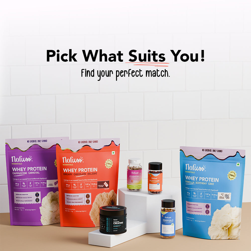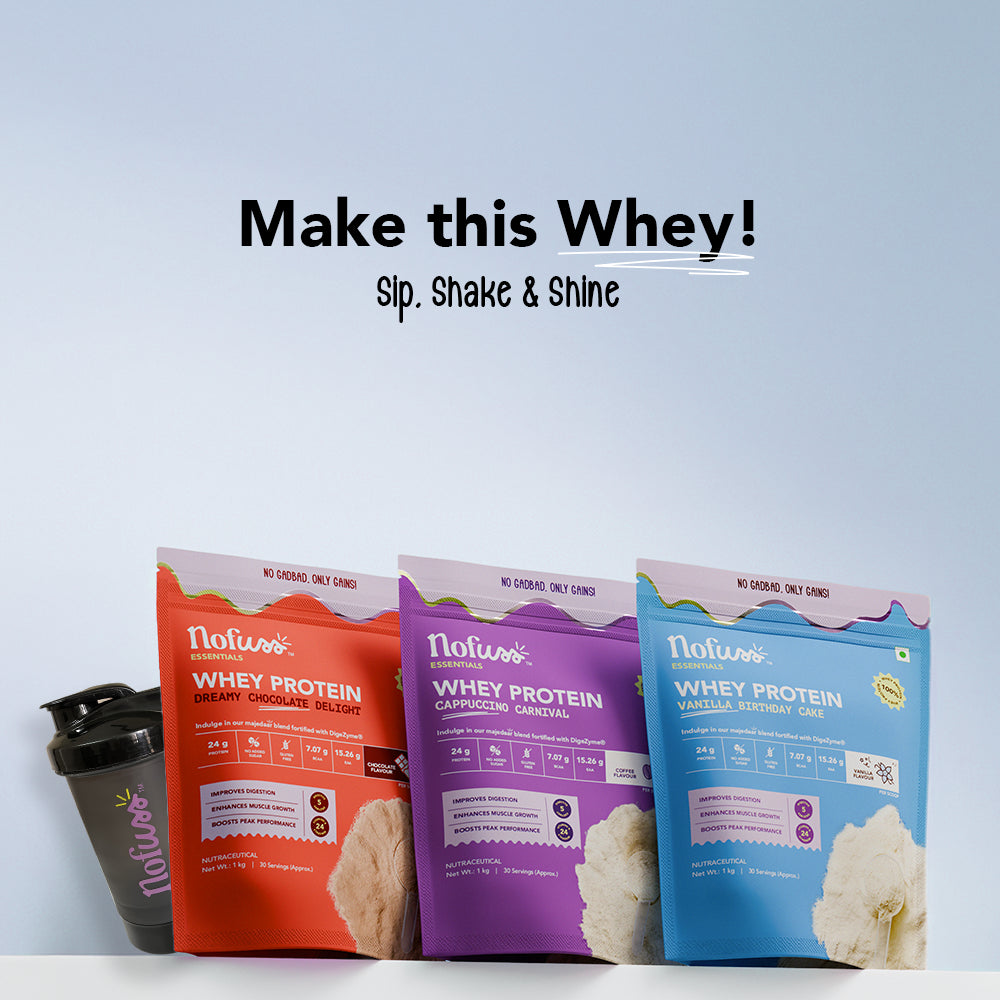 Elevate your well-being with NoFuss Whey Protein, fortified with DigeZyme®—a proprietary blend of 5 digestive enzymes and a power-packed mix of 24 essential vitamins and minerals designed to improve digestion, enhance muscle growth and boost peak performance in 3 exciting flavours: Dreamy Chocolate Delight | Cappuccino Carnival | Vanilla Birthday Cake