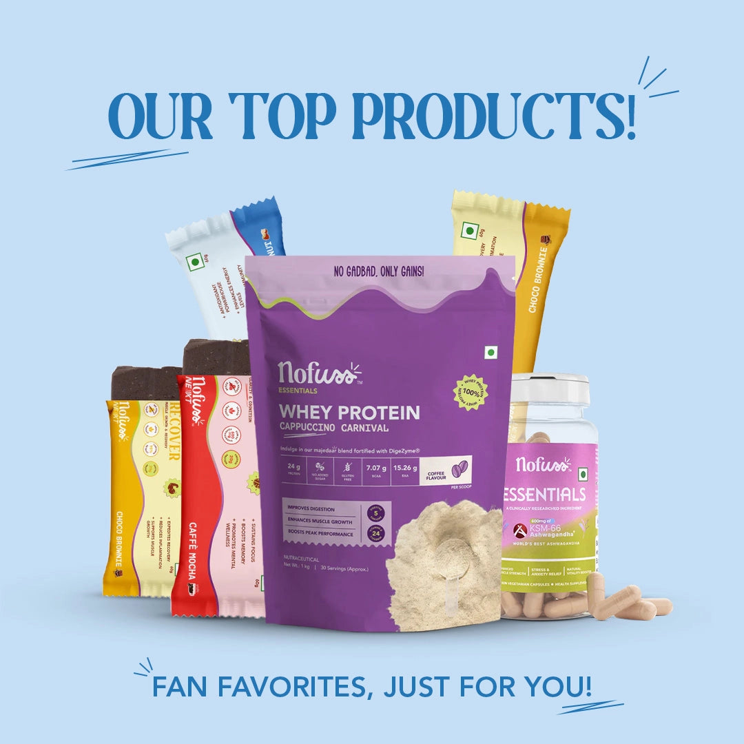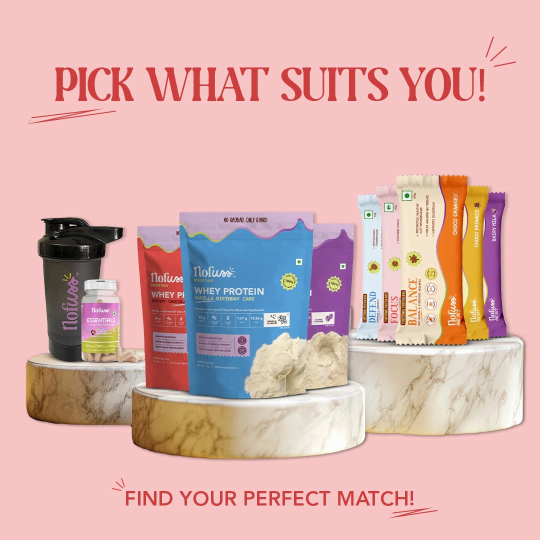 Elevate your well-being with NoFuss Essentials Whey Protein, fortified with DigeZyme®—a proprietary blend of 5 digestive enzymes and a power-packed mix of 24 essential vitamins and minerals designed to improve digestion, enhance muscle growth and boost peak performance in 3 exciting flavours: Dreamy Chocolate Delight | Cappuccino Carnival | Vanilla Birthday Cake
