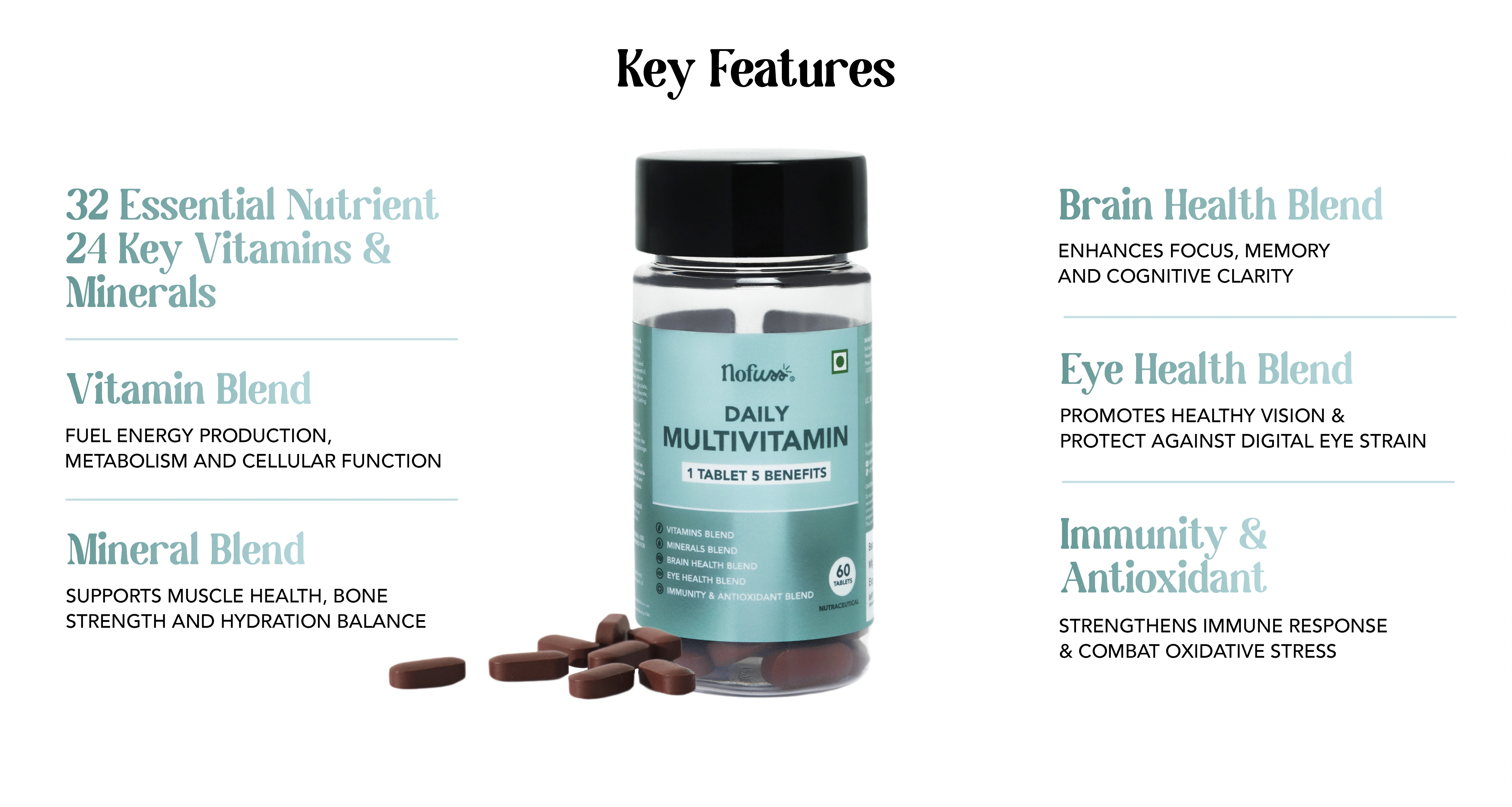 A complete, science-backed multivitamin designed to power your health from every angle. With 32 essential nutrients, including 24 key vitamins and minerals, this formula delivers targeted support through five powerful blends for daily wellness and vitality.