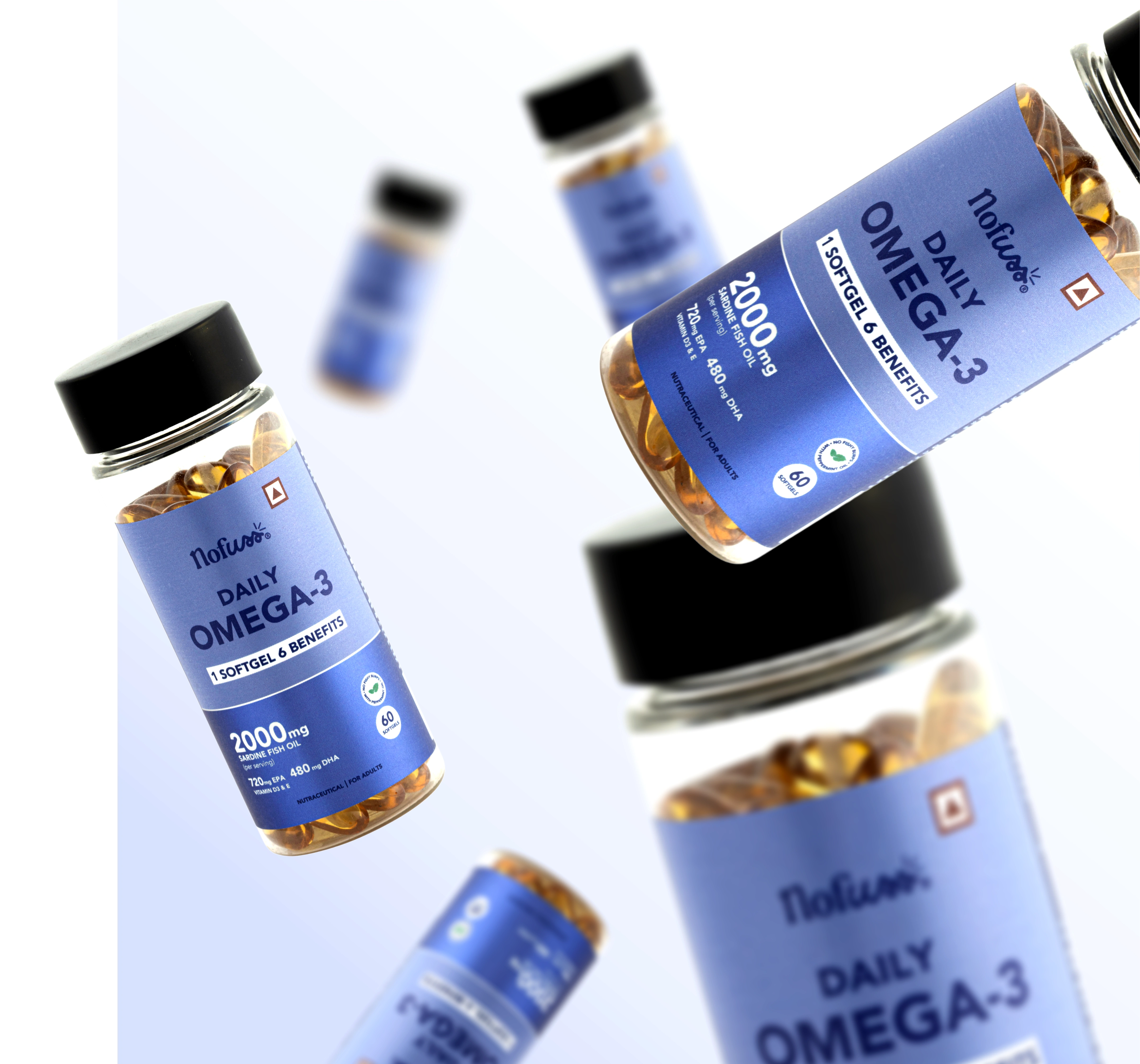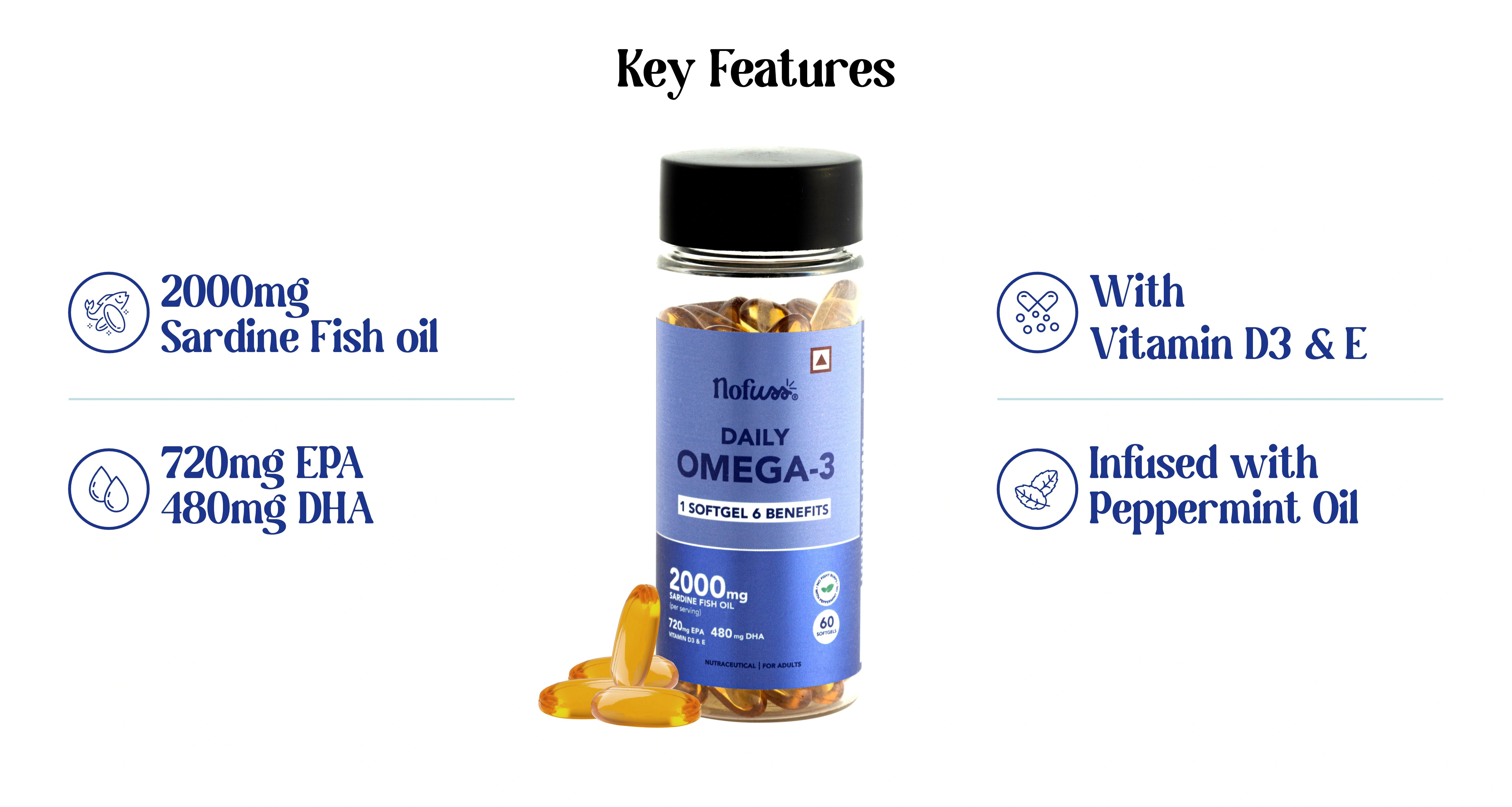 A high-potency, science-backed Omega-3 formula crafted to fuel your health from the inside out. Each serving of NoFuss Daily Omega-3 delivers 2000mg of pure Sardine Fish Oil, including a concentrated dose of 720mg EPA and 480mg DHA—plus added Vitamin D3 and Vitamin E for amplified benefits and daily vitality.